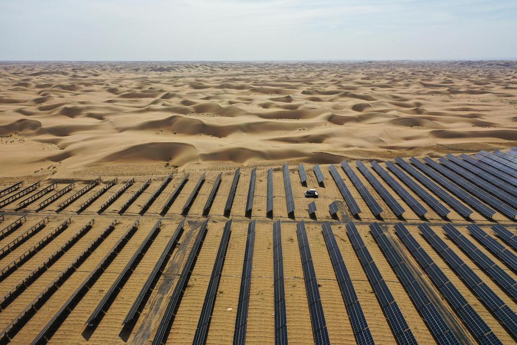 这是6月5日拍摄的位于巴彦淖尔市磴口县的乌兰布和东北部新能源基地100万千瓦光伏先导工程项目,该项目地处内蒙古西部的乌兰布和沙漠(无人机照片)。新华社记者 李志鹏 摄